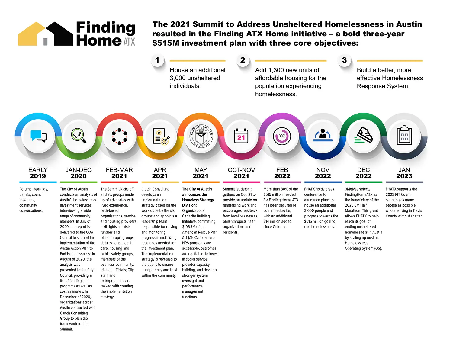The Finding Home ATX press conference and media day event successfully generated awareness, engaged key stakeholders, and highlighted the progress made towards addressing homelessness in Austin. The coalition’s efforts were widely publicized, covered by the Austin-American Statesman, KVUE, Community Impact and KXAN.